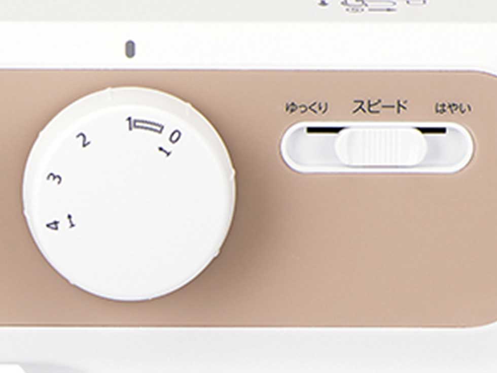 安心のゆっくりスタート、ゆっくり返し縫い。縫いスピード調節はスライドスイッチで無段階。