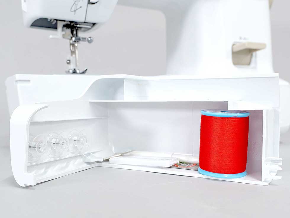 補助テーブル内側に付属品やボビン3つを直接収納することができます。