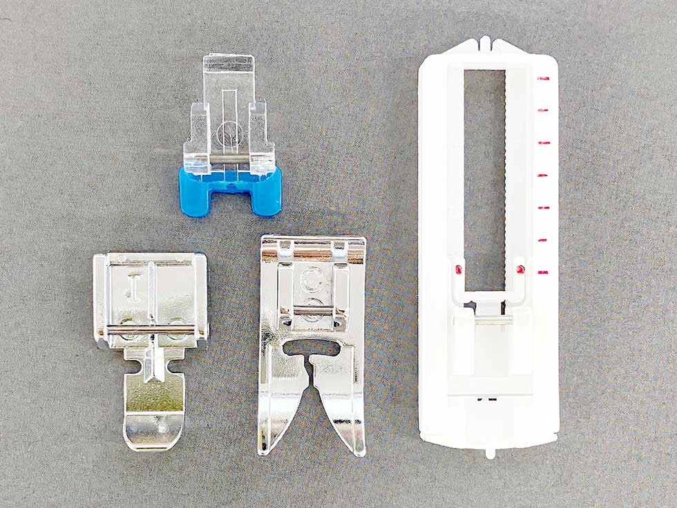 標準押え、ボタンホール押え、ボタン付け押え、ファスナー押えが付属。