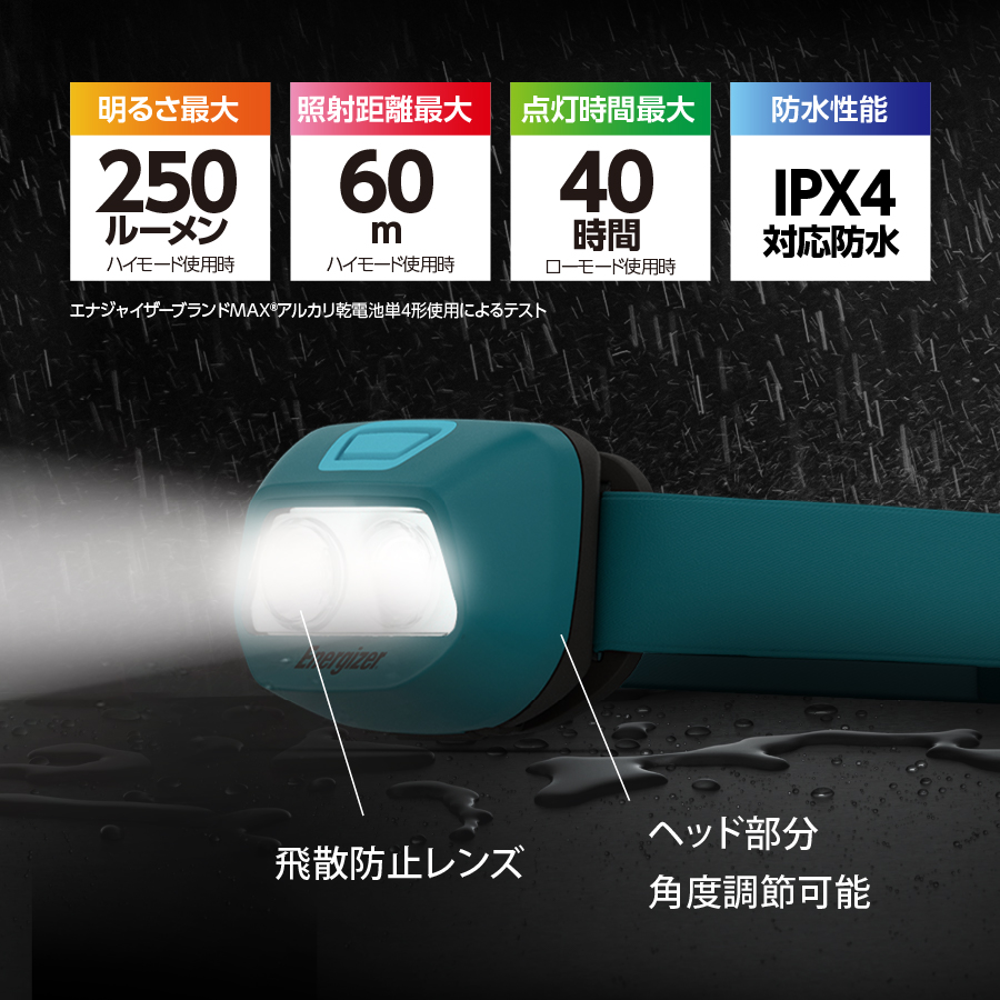 性能テストにおける注釈 *エナジャイザーブランドアルカリ乾電池使用によるテスト