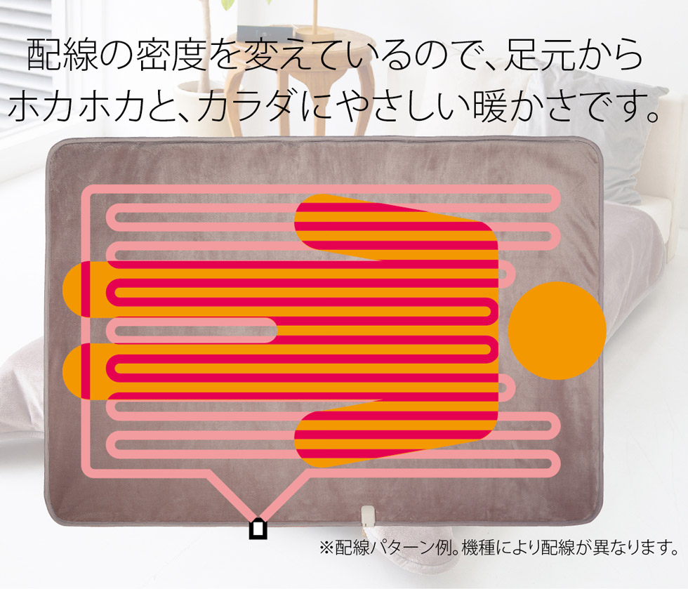 配線の密度を変えているので足元からホカホカと、カラダにやさしい暖かさです。