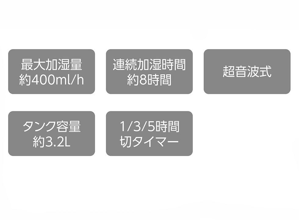 1時間当たりの加湿能力加湿量:100(弱)/150/200/300/400(強)ml/h