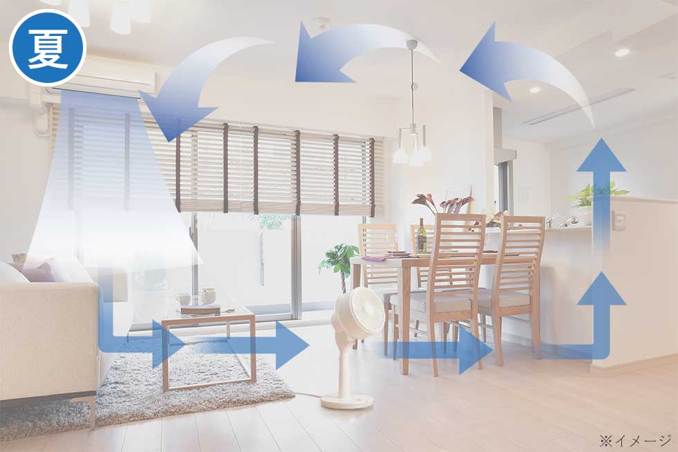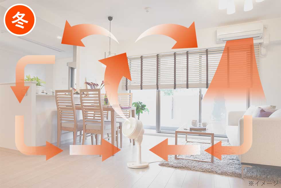 冬は上に溜まる暖気を拡散、足元に温かい空気を届けます。
