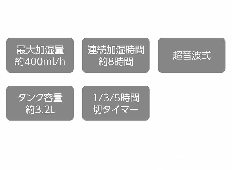 1時間当たりの加湿能力加湿量:100(弱)/150/200/300/400(強)ml/h