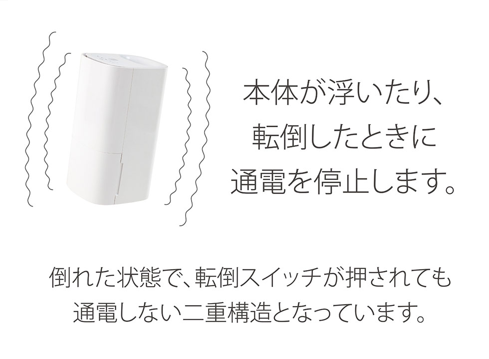 倒れた状態で転倒スイッチが押されても、通電しない二重構造です。