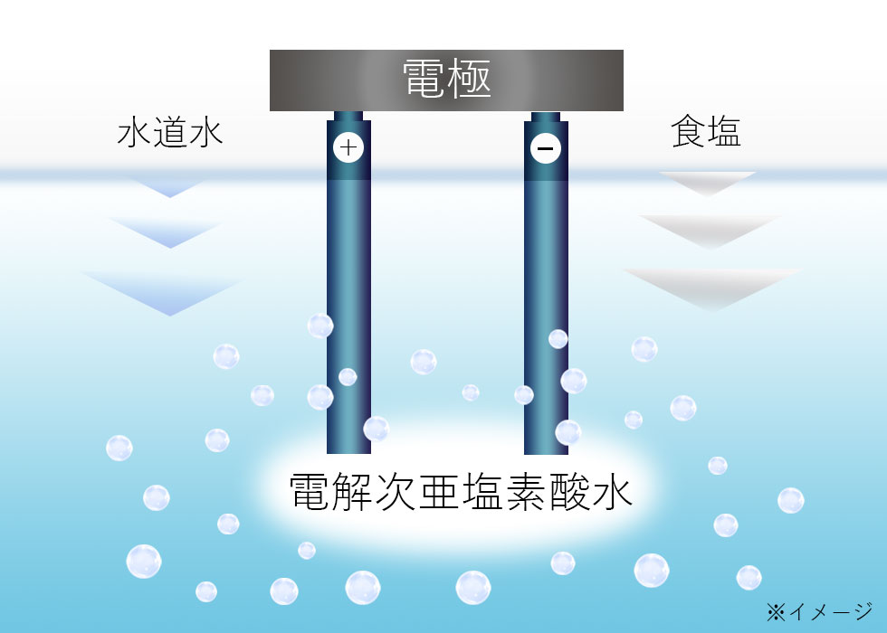 塩水に特殊な電極をあてることで「電解次亜塩素酸水」を生成します。