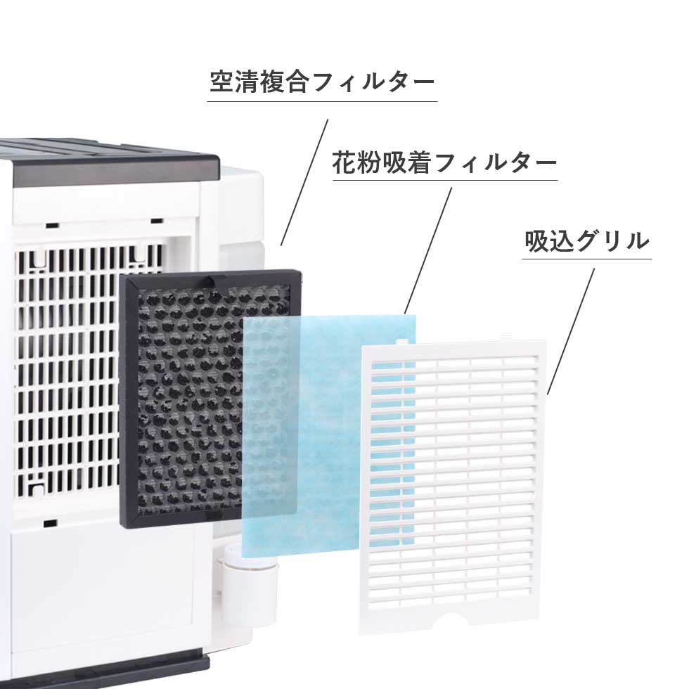 空清複合フィルター「活性炭フィルター」+「HEPAフィルター」と「花粉吸着フィルター」が花粉などのアレル物質、タバコの煙、ハウスダストなどを集塵します。