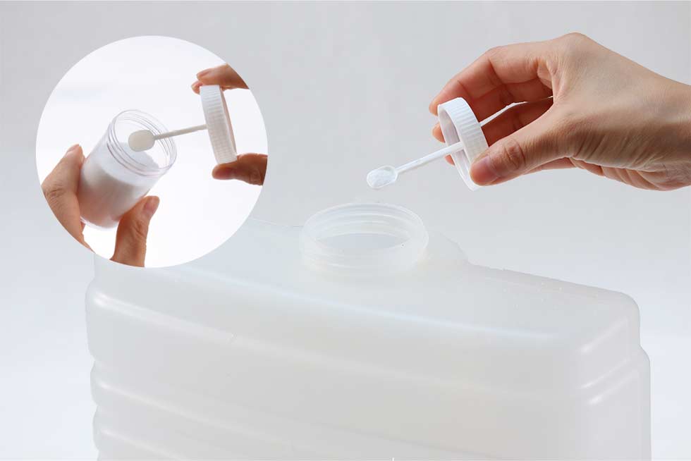 水タンク満水に、専用さじで2~5杯(0.8~2.0g)が目安です。
