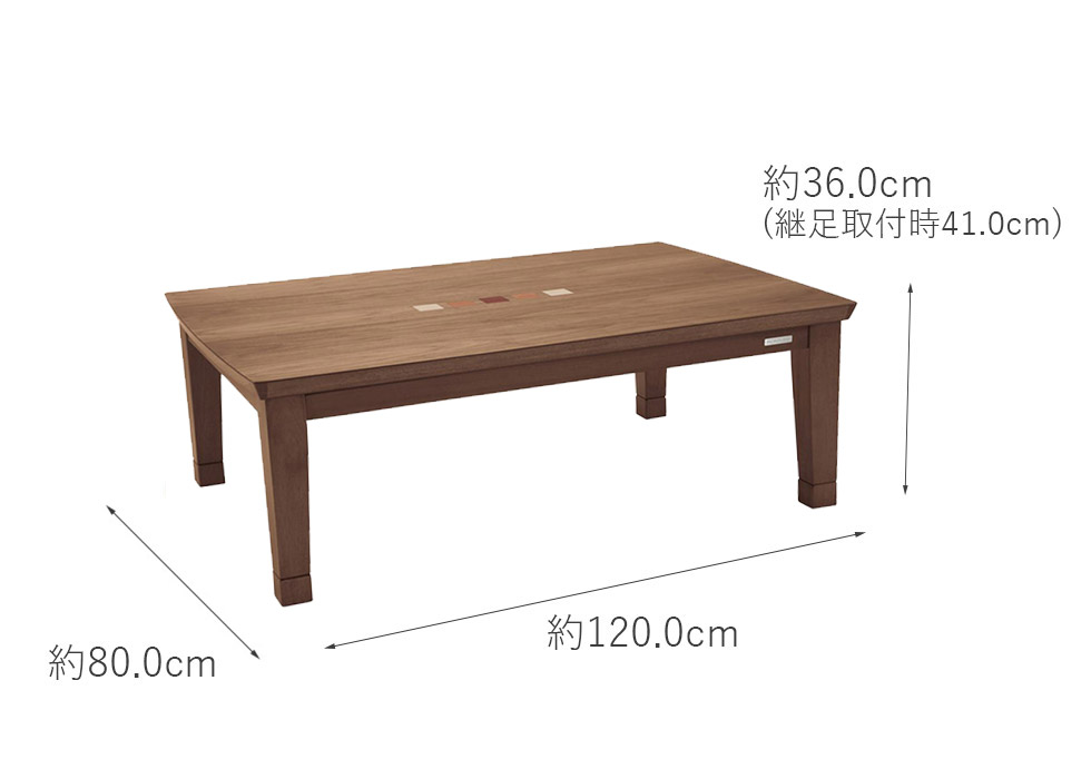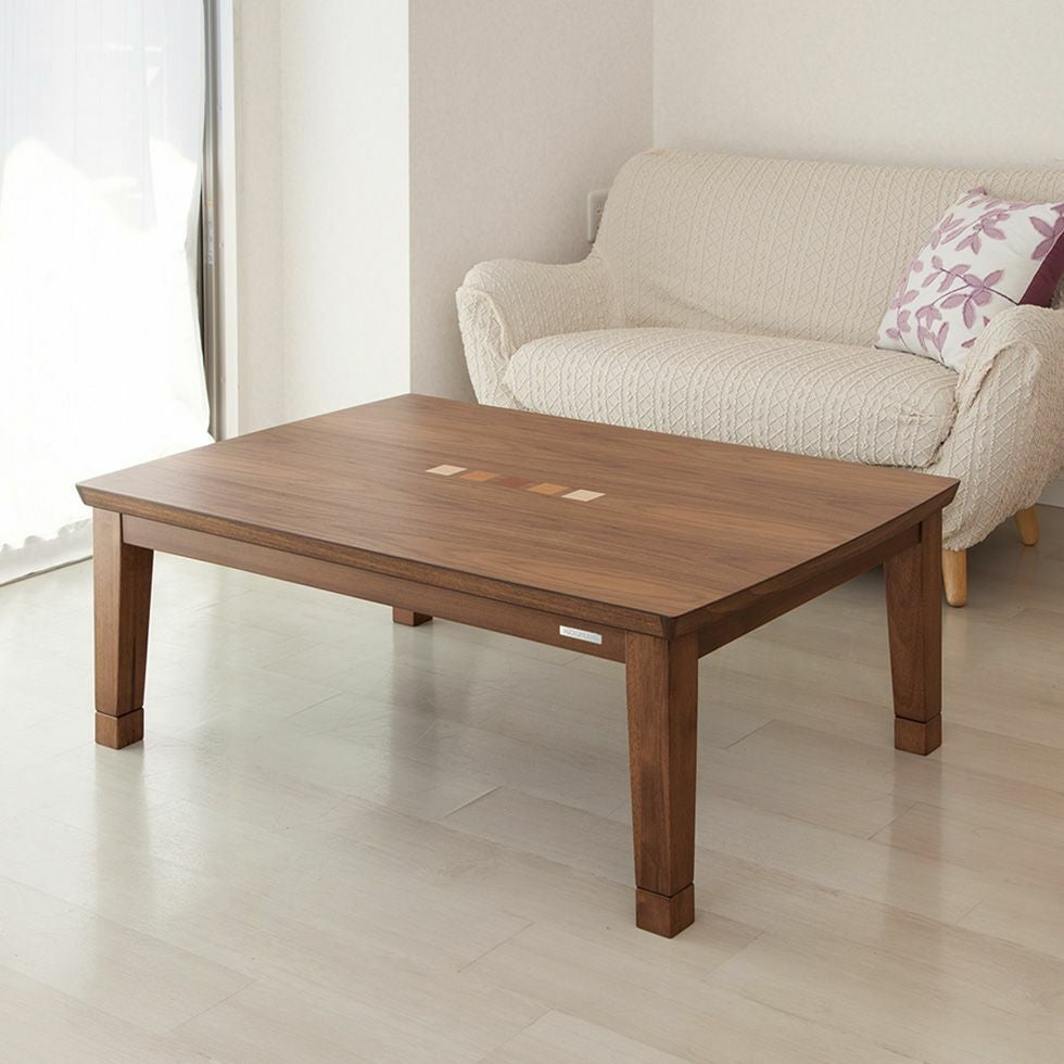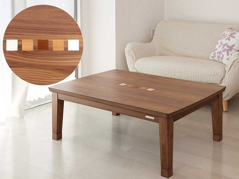 ウォールナット天板の中央に象嵌があり、インテリア性の高いテーブルこたつです。