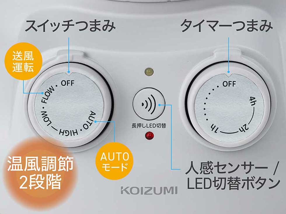FLOW(送風)~約600W(LOW)~1200W(HIGH)~AUTOのダイヤル調節で好みの温度に。