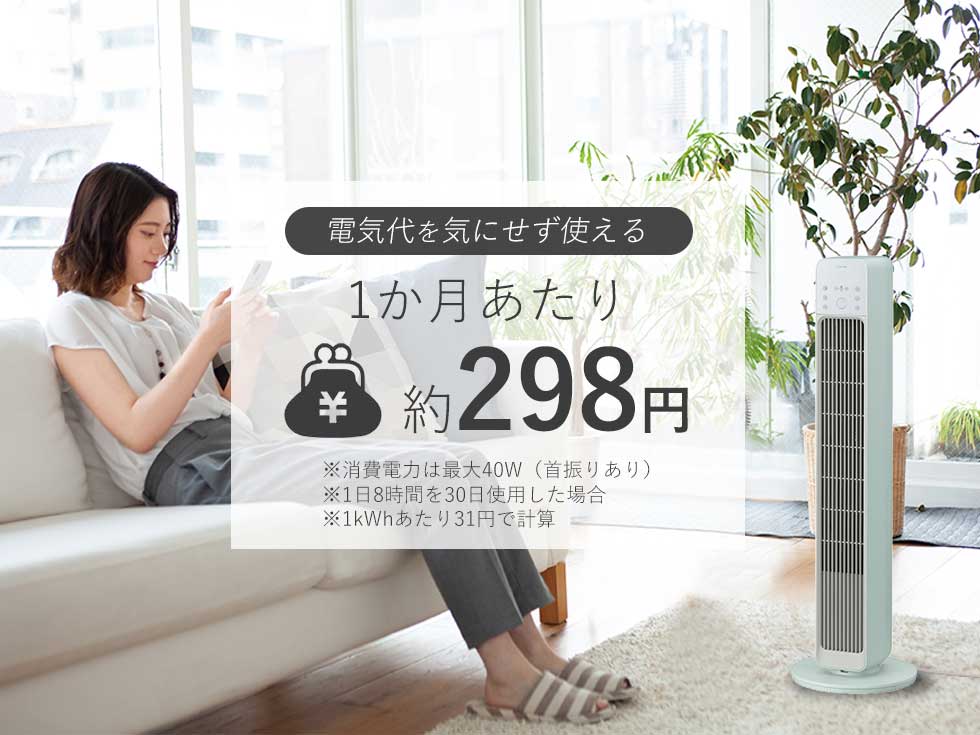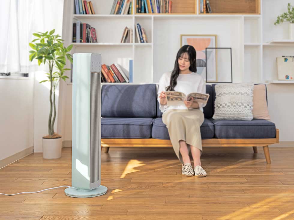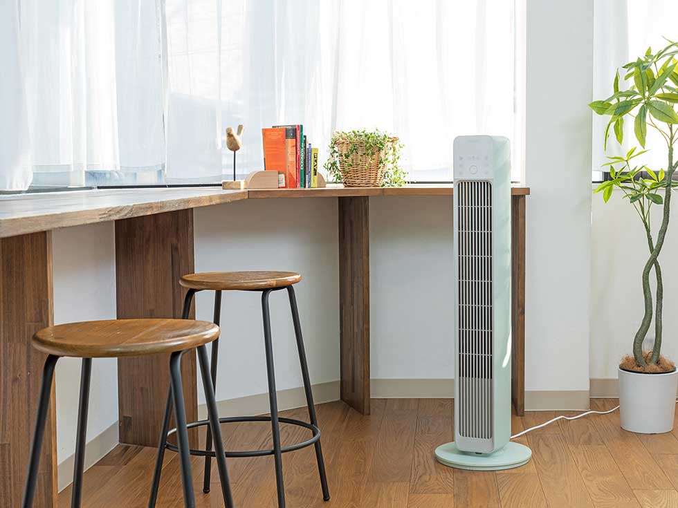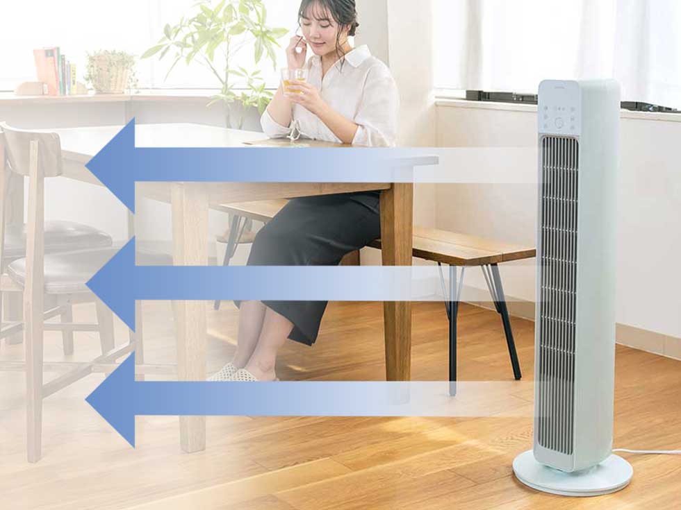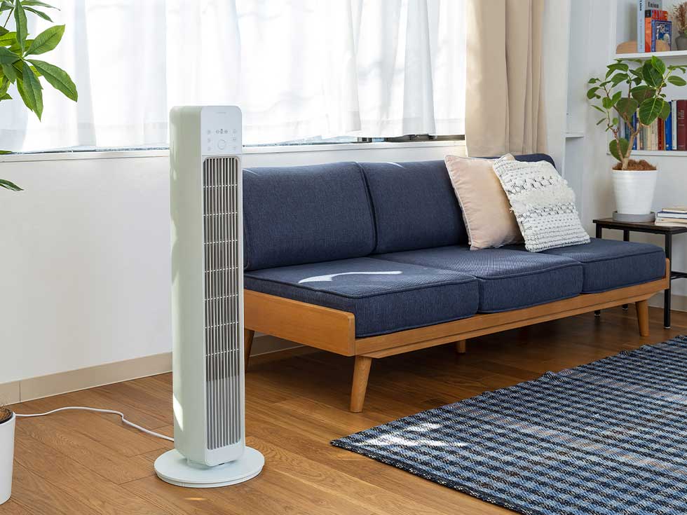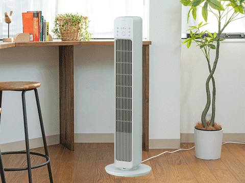 お部屋の印象を邪魔しにくい、縦型デザインのタワーファンです。