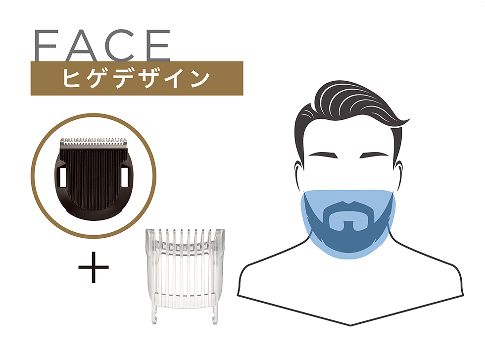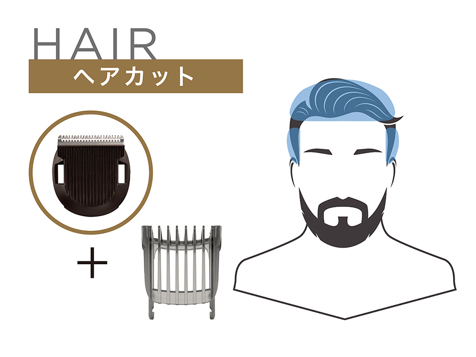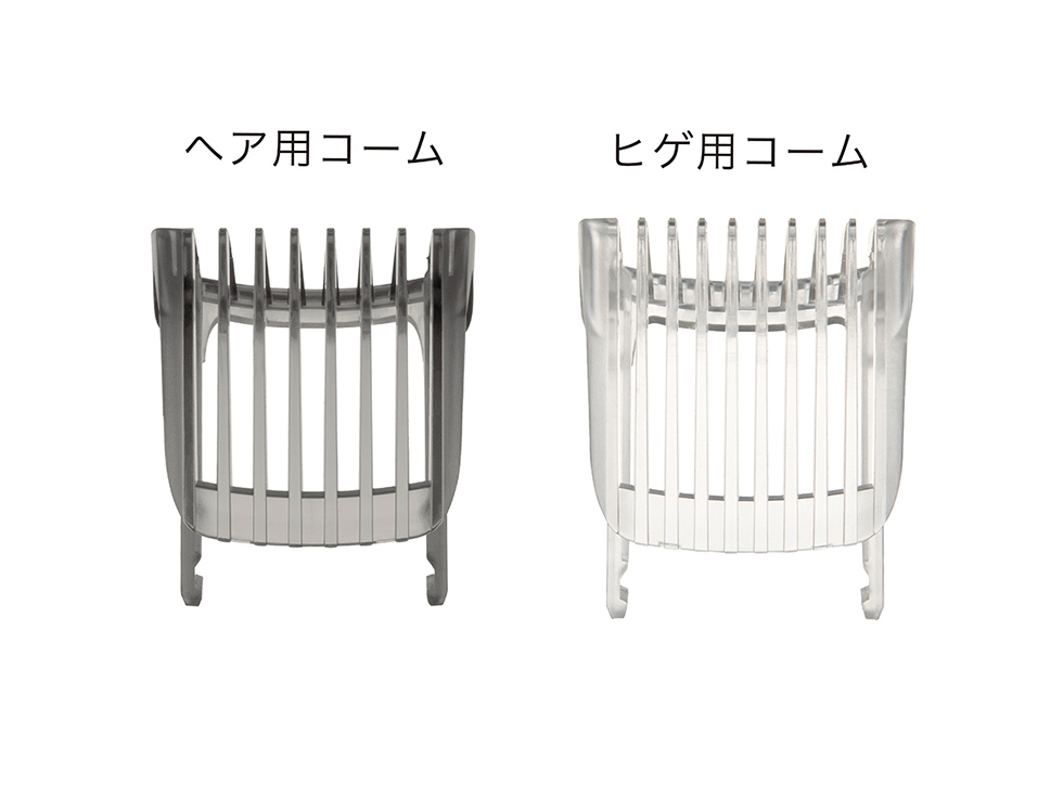 ヘア用コームとヒゲ用コームの2種類付属で、気になる部位に合わせたケアが可能に。